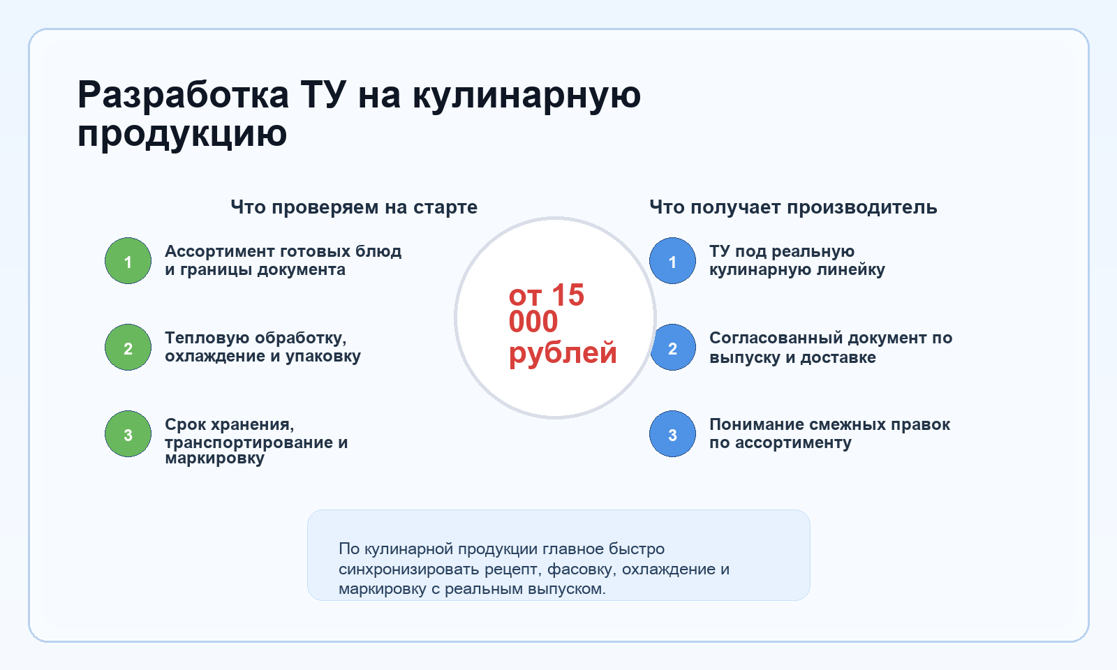 Присылайте перечень кулинарных позиций и базовые данные по рецептуре, упаковке и сроку хранения. По этим материалам уже можно понять, какие блюда можно объединить в один документ, а где лучше не смешивать разные сценарии выпуска.