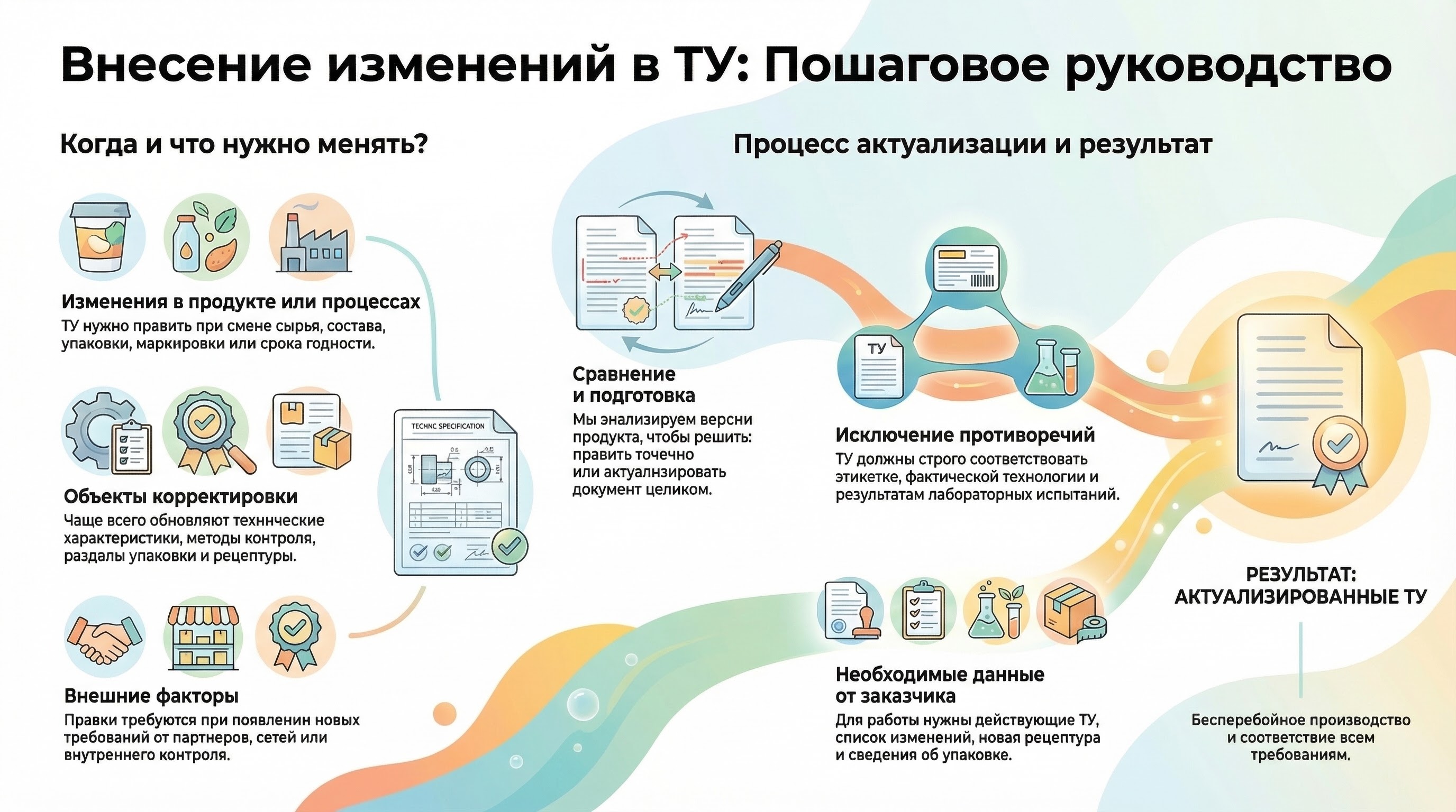 Если продукция изменилась, старые технические условия должны отражать фактический состав, технологию и комплект сопроводительной документации. Иначе документ перестает работать как опора для производства и начинает создавать противоречия между ТУ, маркировкой и реальным продуктом.